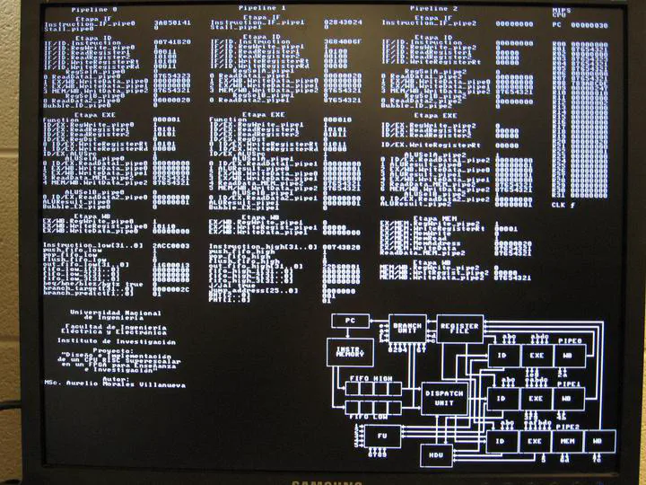 Photo by Aurelio Morales, 2011The purpose of the project was the design of a Superscalar RISC CPU architecture and the prototype-level implementation of this CPU using an FPGA programmable logic device for teaching and research purposes. It is widely known that the development of microprocessors has boomed in recent decades, especially those of RISC architectures, and specifically those of the superscalar types. They are increasingly more powerful, and capable of performing complex calculations in less time. However, for teaching and research purposes, it is not possible to have specific hardware platforms based on RISC architecture CPUs due to their high cost. On the other hand, there are software applications for CPU simulation, but they only simulate the execution of the software at the assembly language level, without seeing the influence of the software execution on the behavior of the CPU hardware, which would allow a complete understanding of the operation of the CPU. In this project, a RISC Superscalar CPU will be designed and implemented at prototype level, based on the MIPS architecture, in such a way that a 2-way Superscalar CPU with 3 pipeline queues will be implemented, along with the Dispatch Unit (DU), Hazard Detection Unit (HDU), Data Forwarding Unit (FU) and Branch Prediction Unit (BU). The design will be restricted to a subset of the integer instructions of the MIPS32 architecture CPU, and floating point instructions will not be implemented. It is worth mentioning that the MIPS architecture is widely studied worldwide in universities at the undergraduate and graduate levels. The project will emphasize the use of the VHDL hardware description language, and the design will be implemented in the DE2 board from Terasic. Tests will be carried out with different instructions and different instruction sequences in order to check the internal behavior of the CPU, showing the results in a VGA display.
